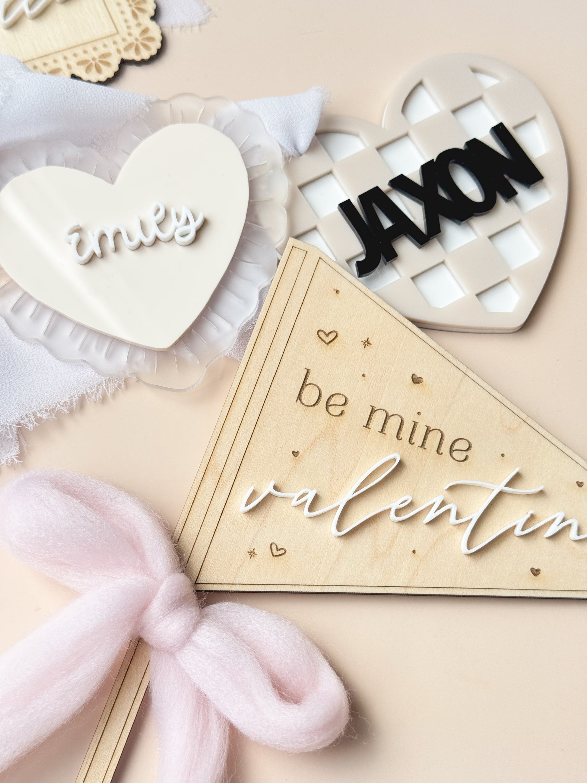 Add a sweet touch to your little one’s Valentine’s basket with our Valentine’s Day Pennant Flags! Made from wood and topped with a 3D white acrylic motif, these mini flags are playful, charming, and totally kid-approved. A perfect keepsake to make Valentine’s Day extra special!