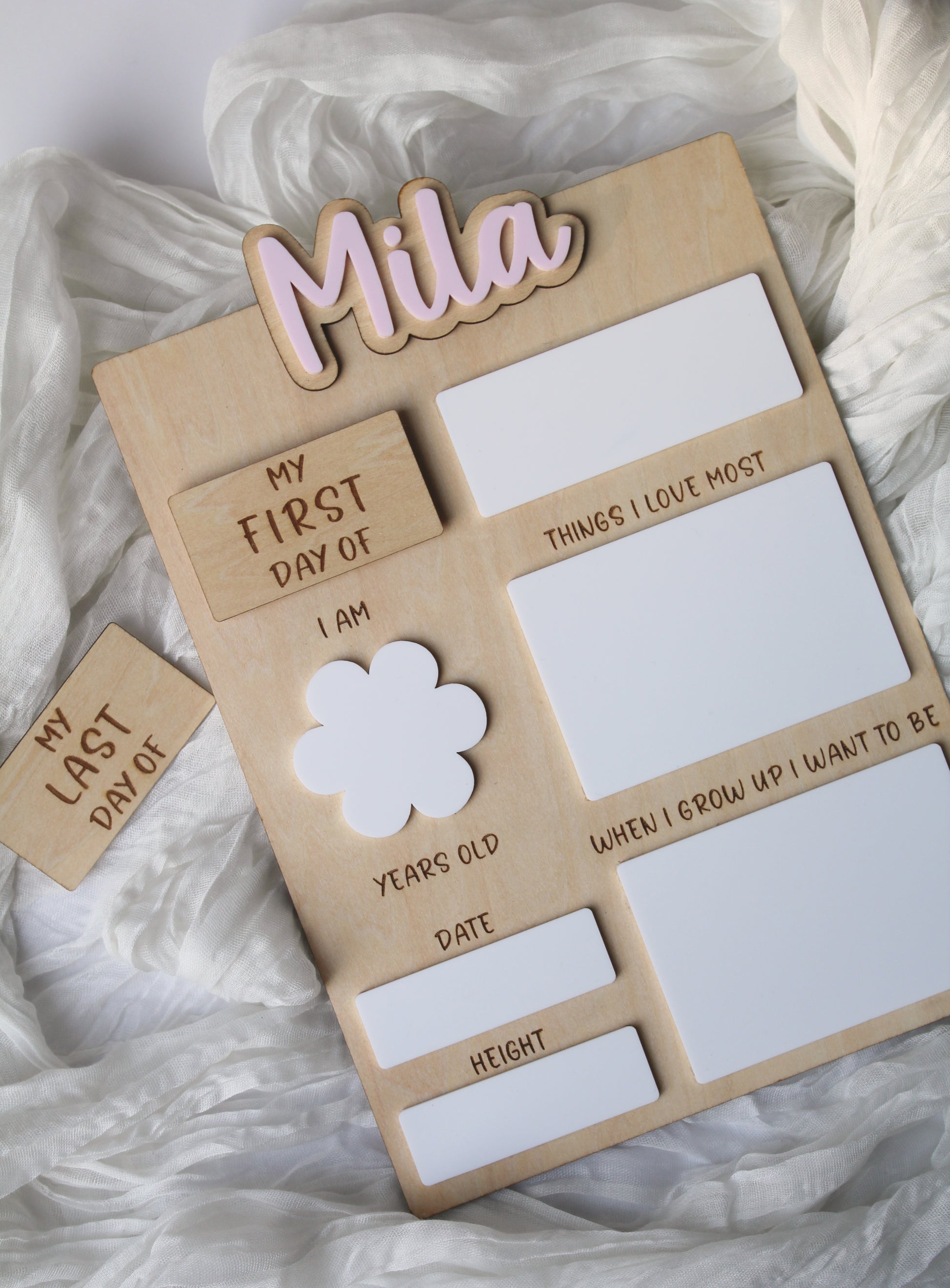 The board includes a interchangeable “First Day” / “Last Day” pieces, secured with Velcro for easy switching.
