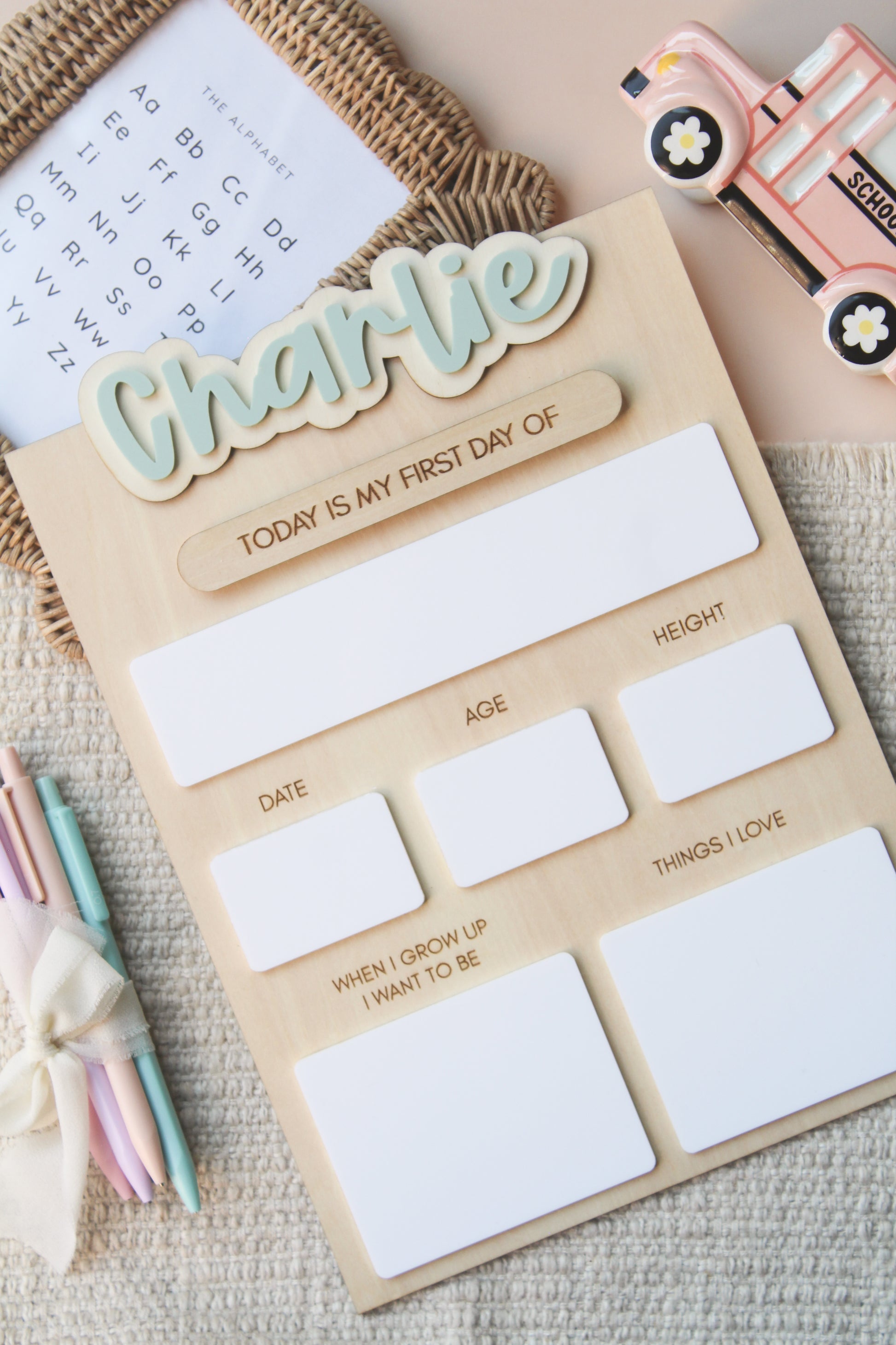Optional Add-On: Personalize your board for multiple children with extra interchangeable name tags. Each name tag attaches with Velcro, allowing for easy switching between siblings, making this board a practical and timeless keepsake for the whole family. Find this option under "School Boards" titled add a name.