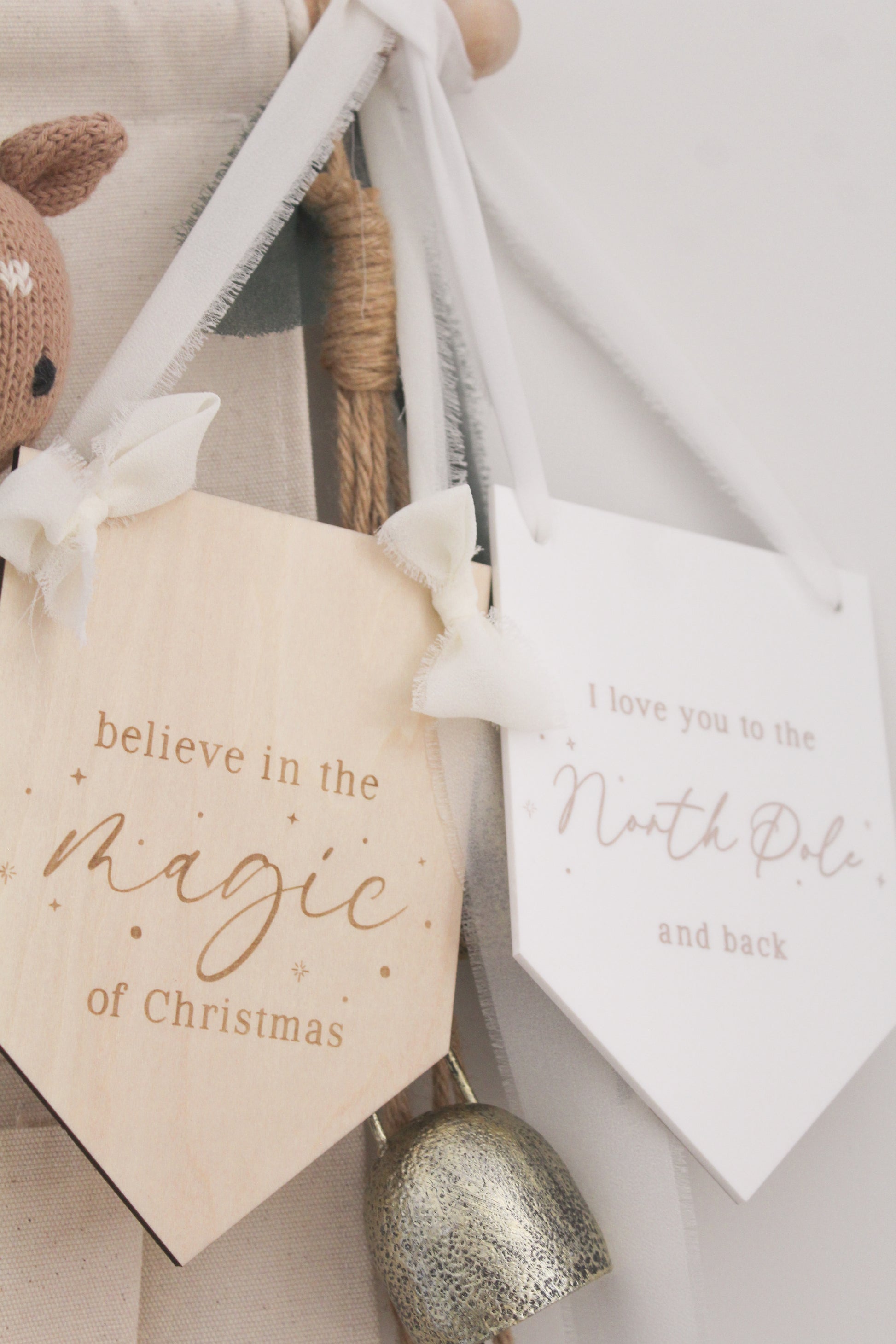 Add a touch of Christmas magic to your space with these hanging decorative signs, available in your choice of engraved wood or acrylic.