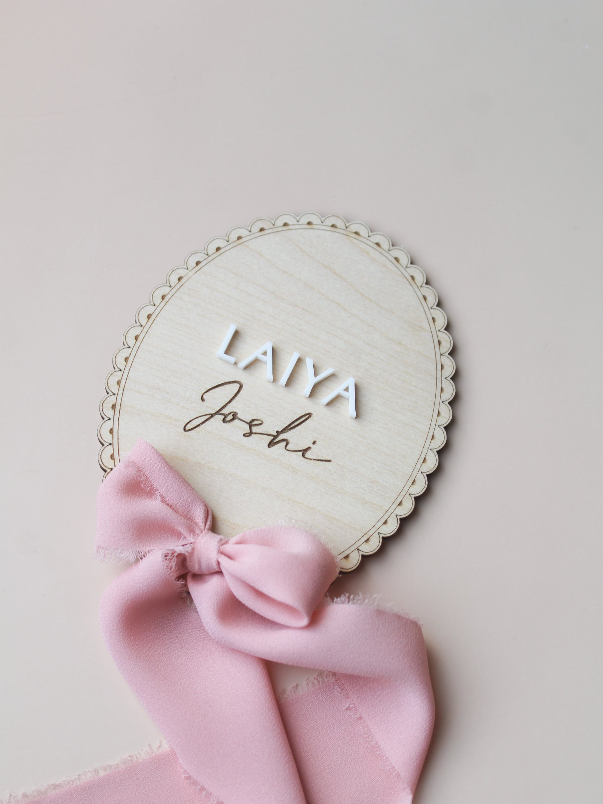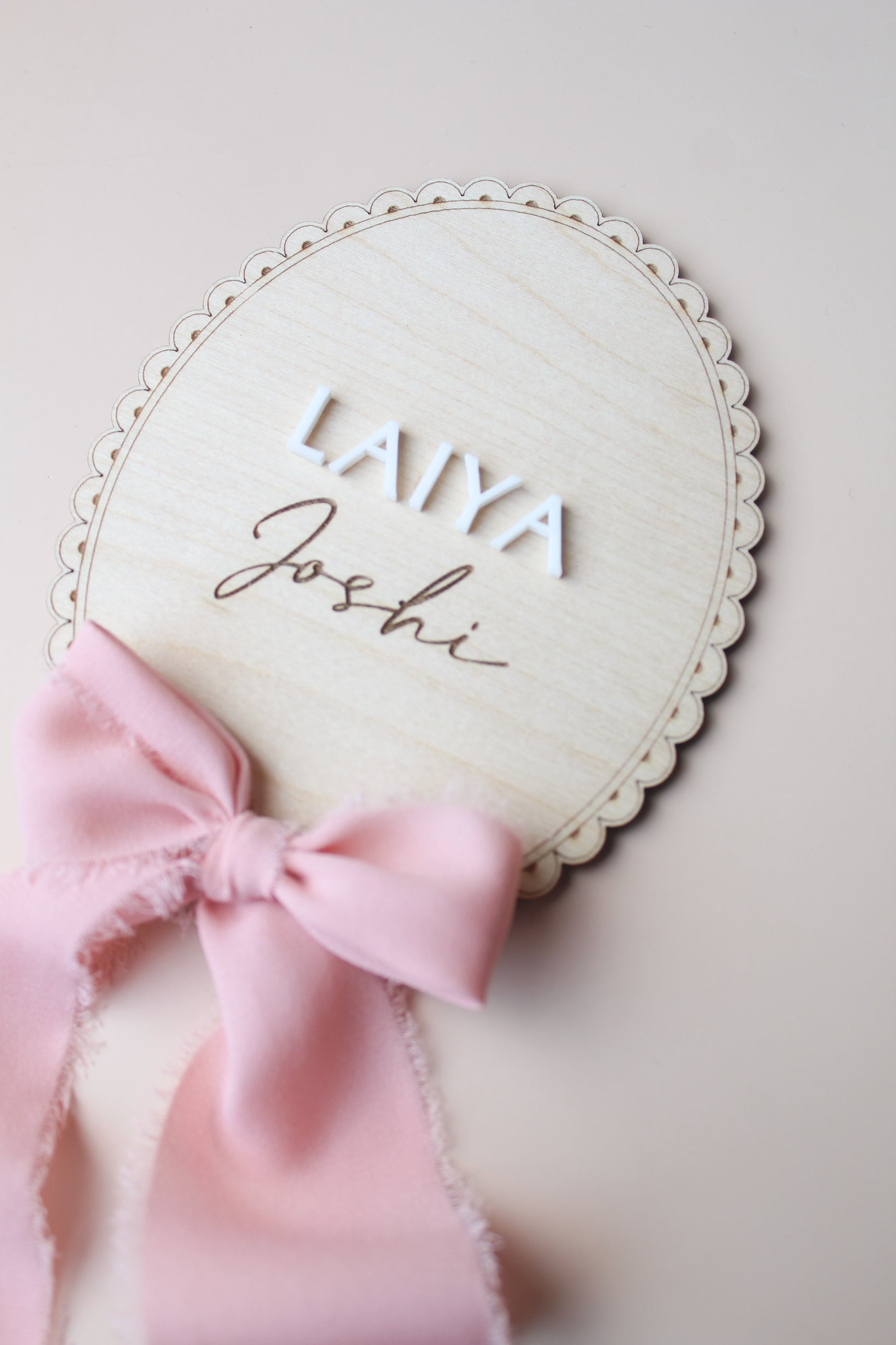 Each piece features a raised acrylic first name in your choice of colour, paired with an engraved middle or last name beneath. The delicate scalloped border is engraved with beautiful detailing and finished with a soft, frayed ribbon bow for a timeless, heartfelt touch.