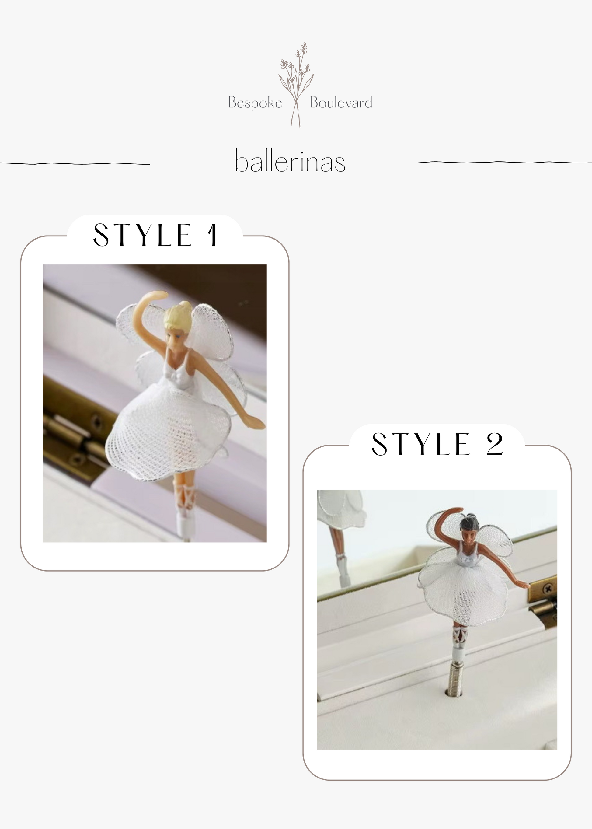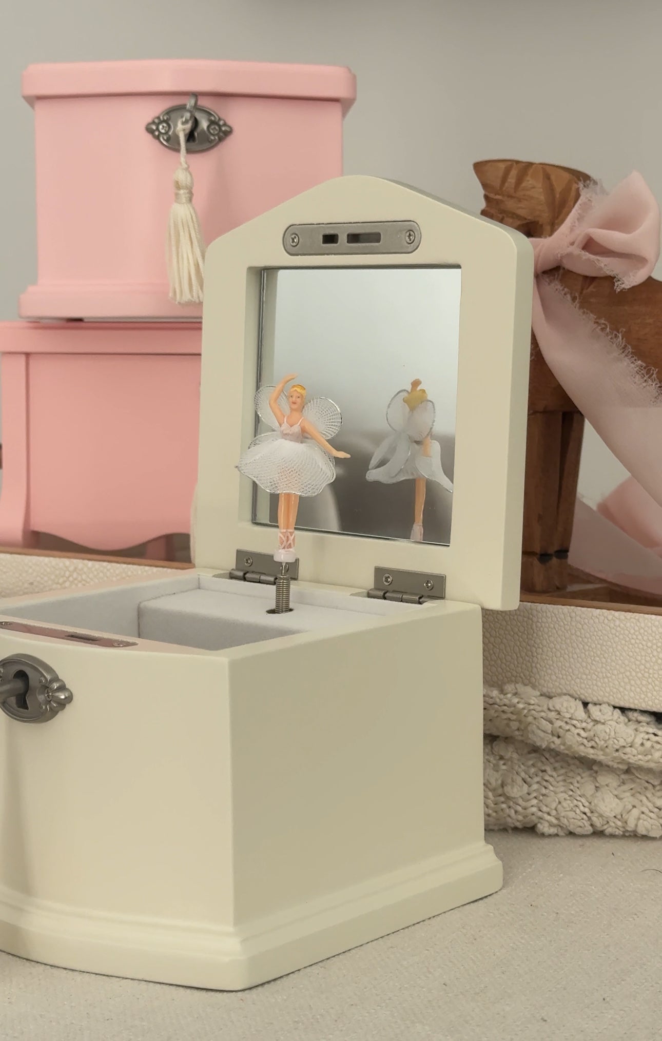 Jewelry boxes play the Swan Lake melody as the ballerina twirls, adding a touch of magic to every moment.